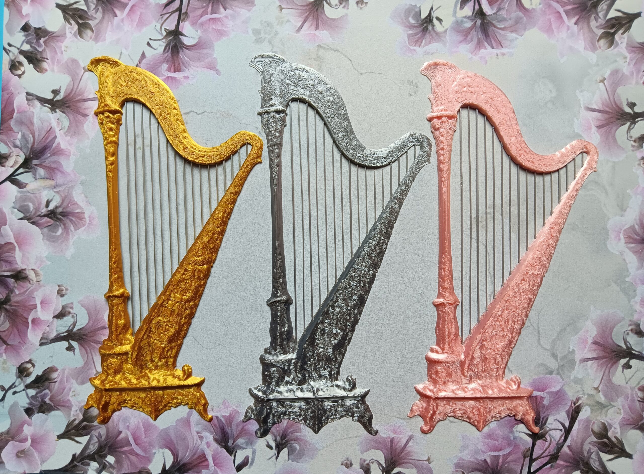 Koristeellinen Mirabilian harppu on noin 10 cm korkea kohokuvio mixed media -askarteluun, kortteihin ja taideteoksiin. Saatavilla sävyissä kulta, hopea ja vaaleanpunainen. Barokkinen muoto tekee siitä näyttävän yksityiskohdan fantasiamaailman projekteihin.