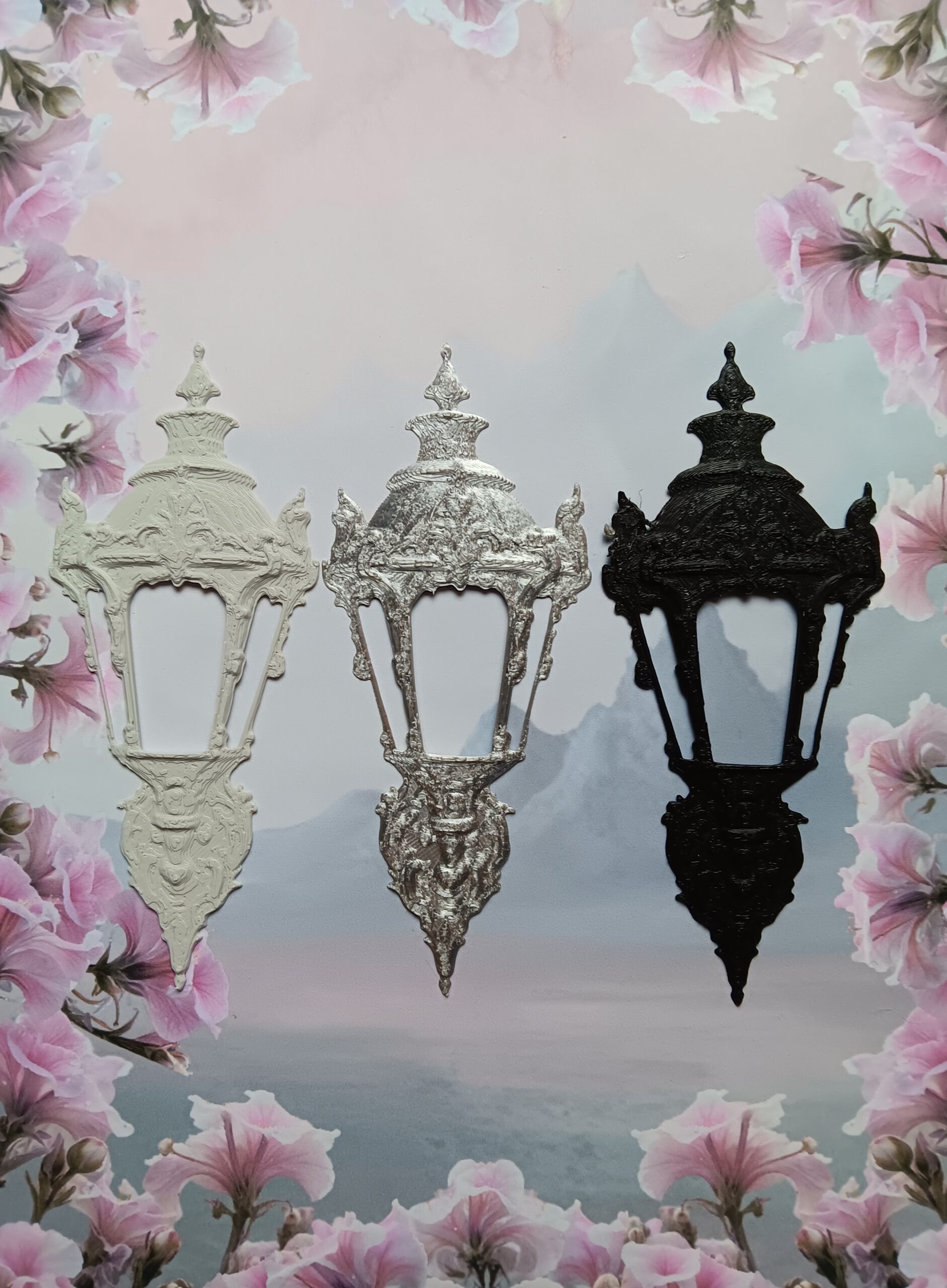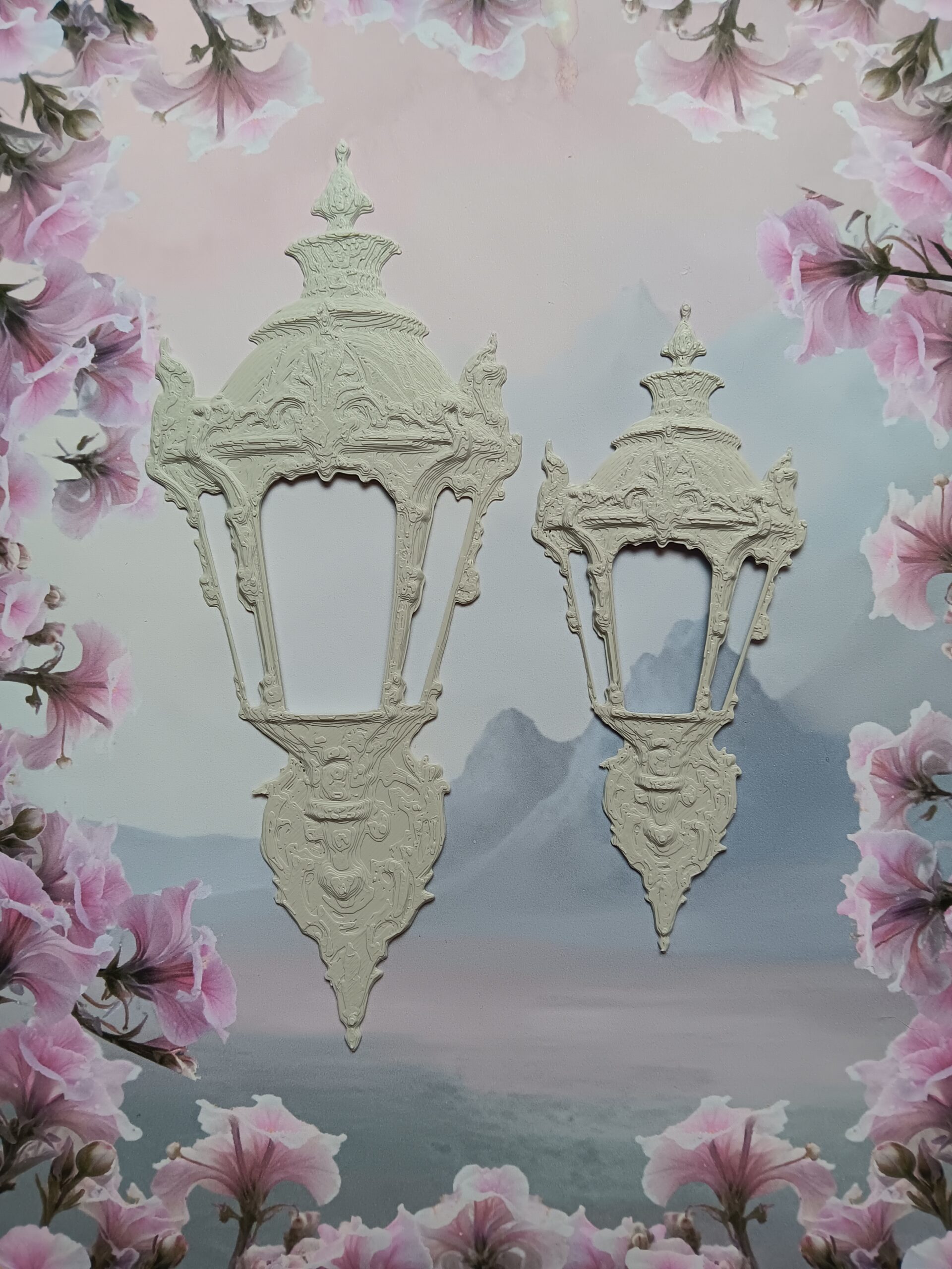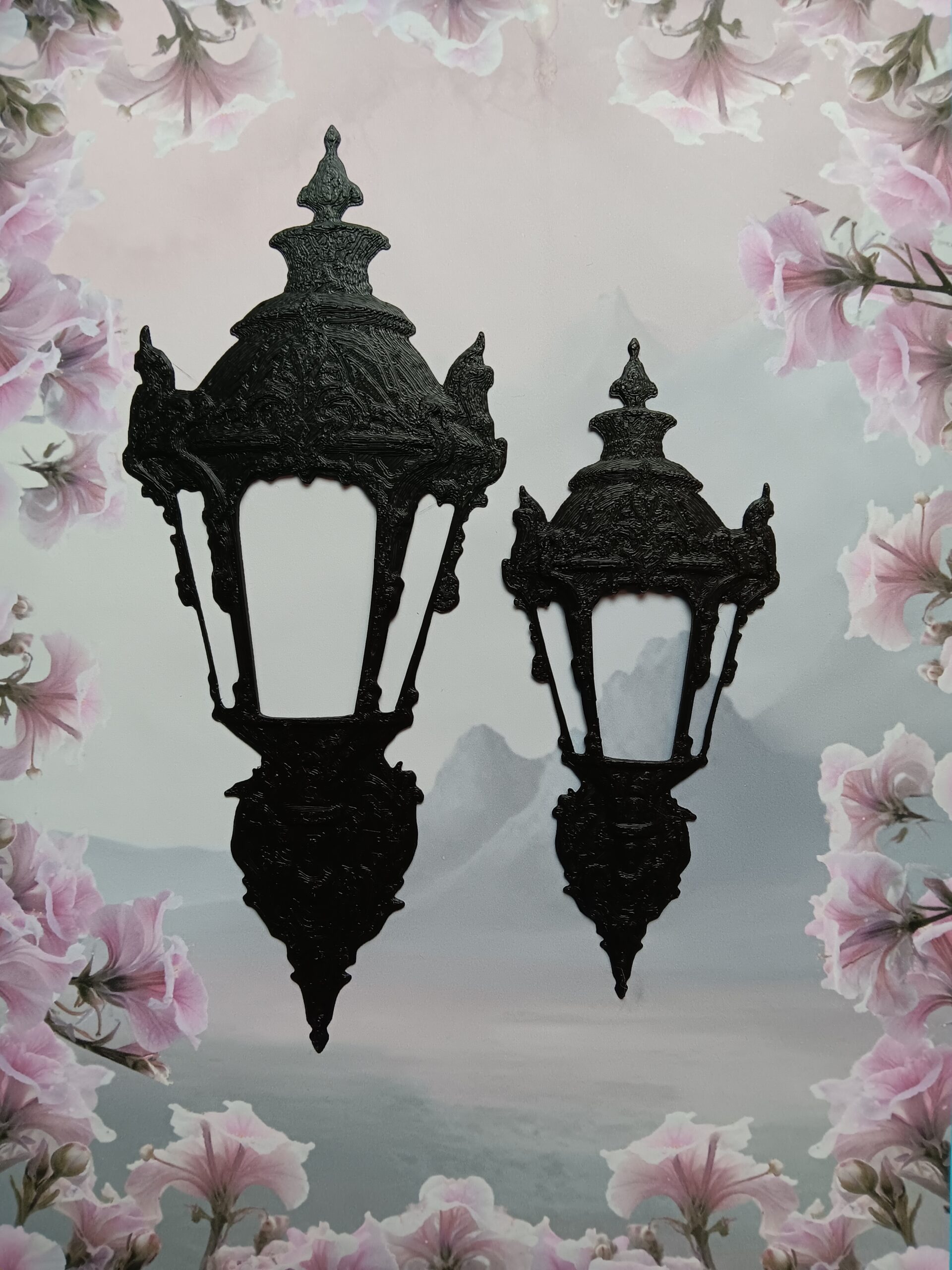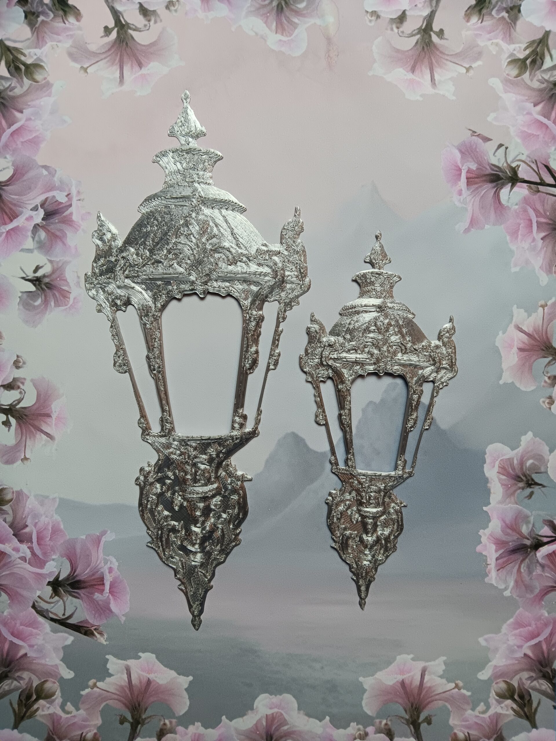 Tämä koristeellinen ulkolyhtyornamentti on kuin pala unohdettua kaupunkia – paikkaa, jossa lyhdyt eivät vain valaisseet katuja, vaan johdattivat kulkijoita toisiin todellisuuksiin. Sen runko kaartuu barokkiseen eleganssiin ja jokainen yksityiskohta tuntuu kantavan mukanaan tarinaa ajasta, jolloin varjotkin kuiskivat.